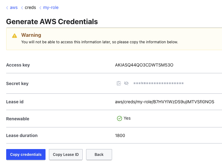 Once logged in, click on the "aws/" secret engine, then select "my-role". You want your "Credential type" to be "IAM User", then click "Generate". You'll see that just like you received on the CLI, you get an access key, a secret key and an associated lease.