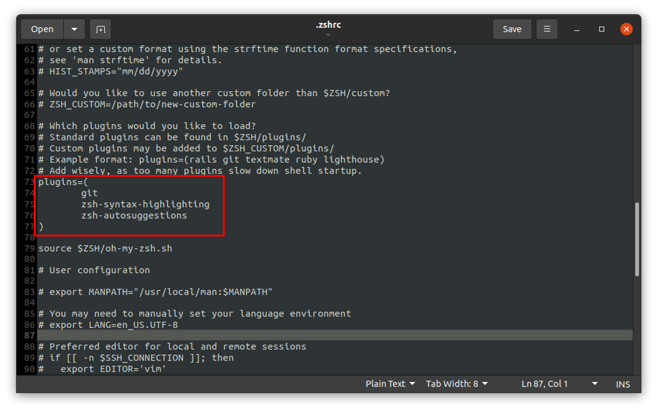 $ git clone https://github.com/zsh-users/zsh-syntax-highlighting.git ${ZSH_CUSTOM:-~/.oh-my-zsh/custom}/plugins/zsh-syntax-highlighting