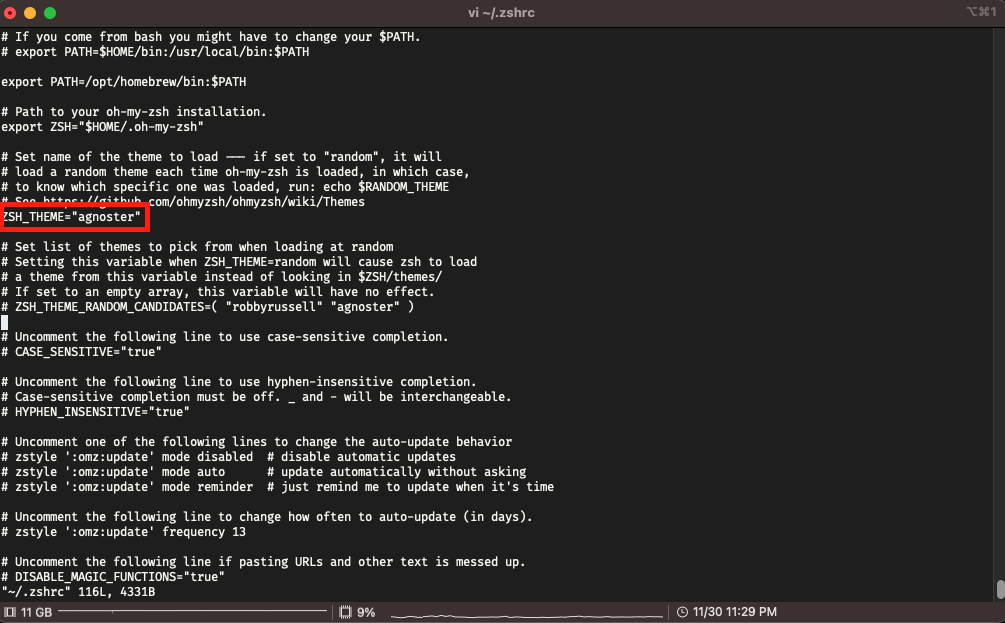 ~/.zshrc 파일을 열고, ZSH_THEME를 agnoster로 변경한다.