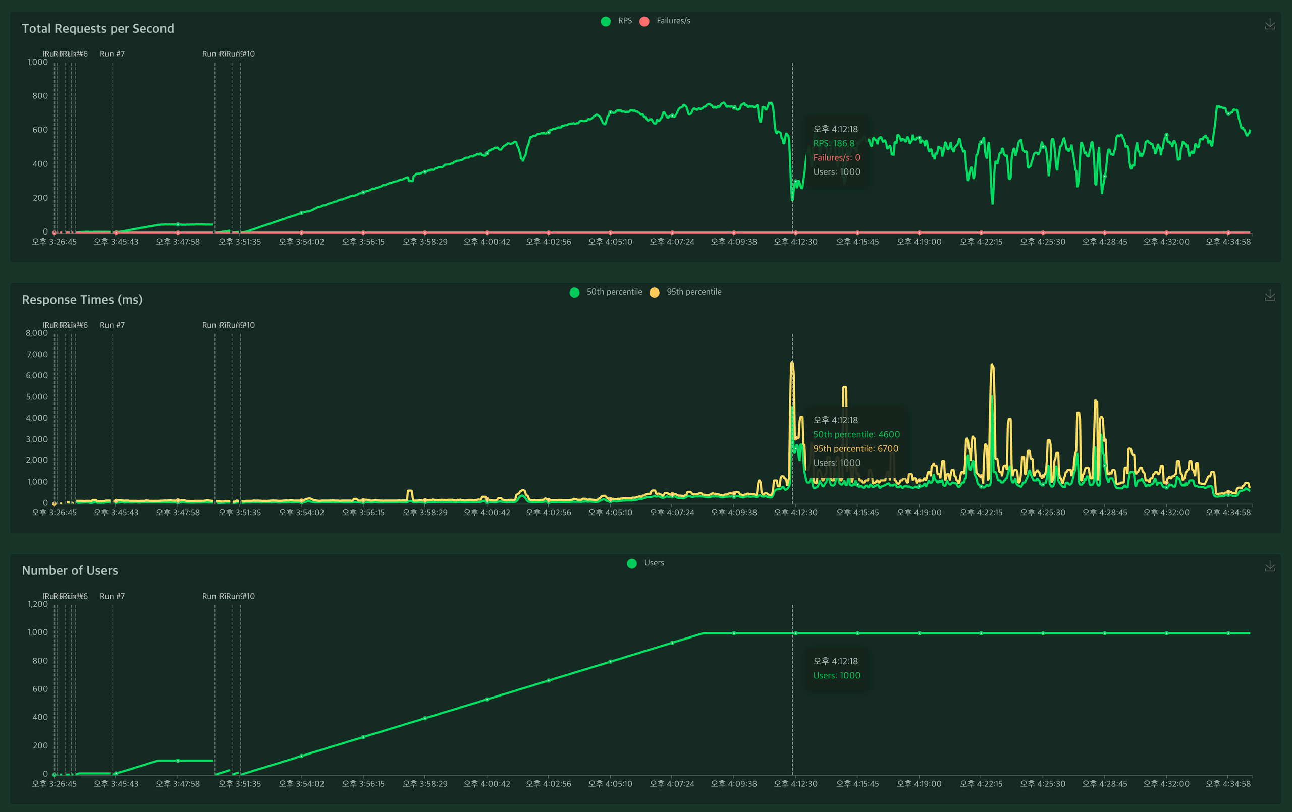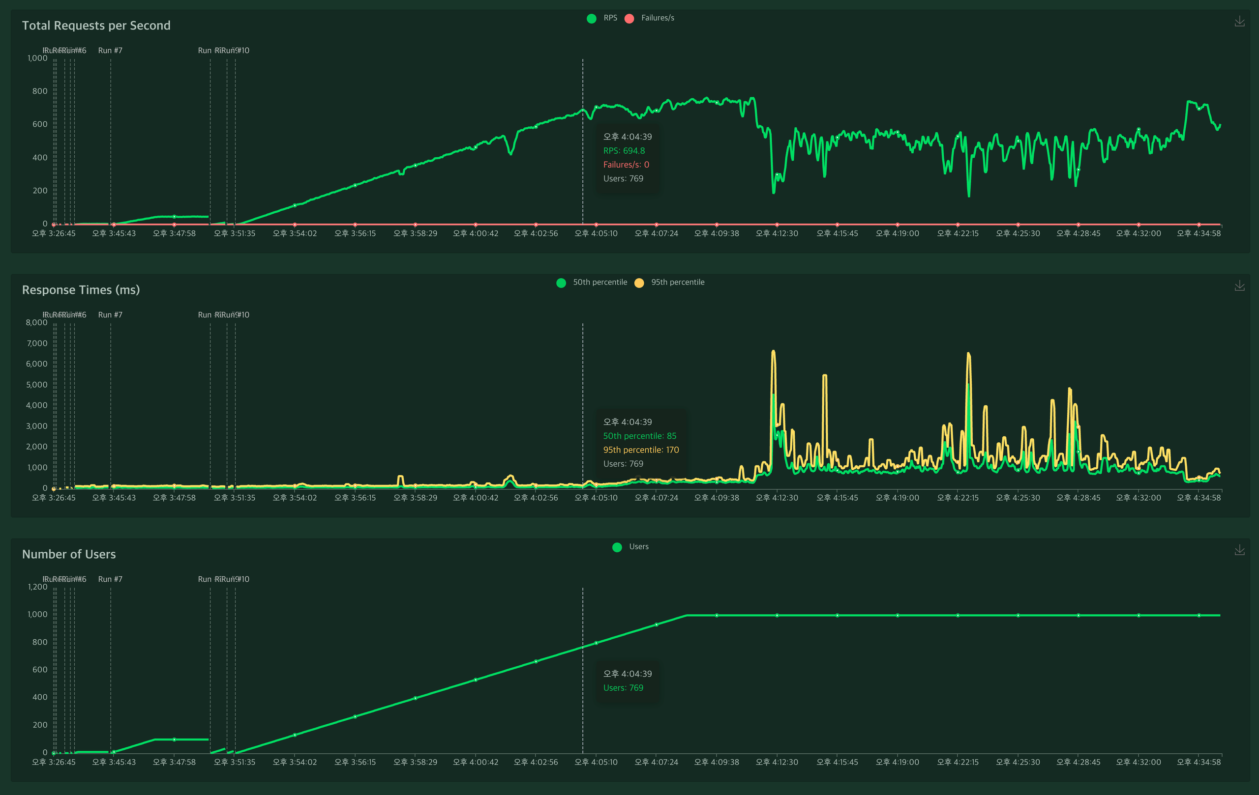 - RPS(초당 요청 개수) 700건 기준으로 최소 85ms 최대 170ms 처리 속도가 유지됨 (실패는 0건)