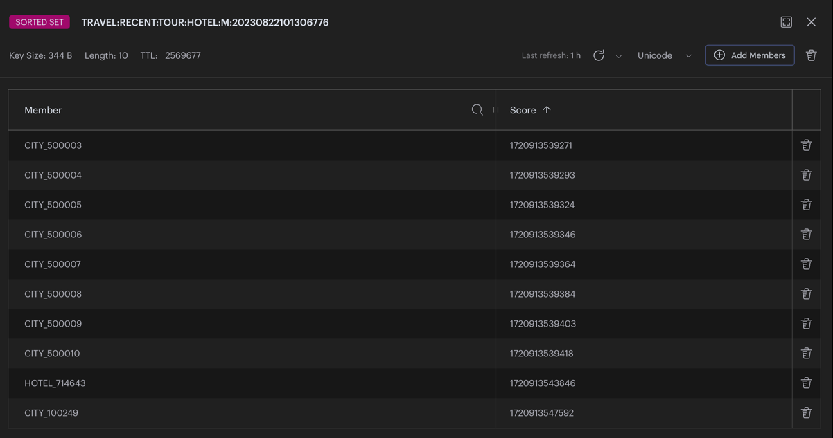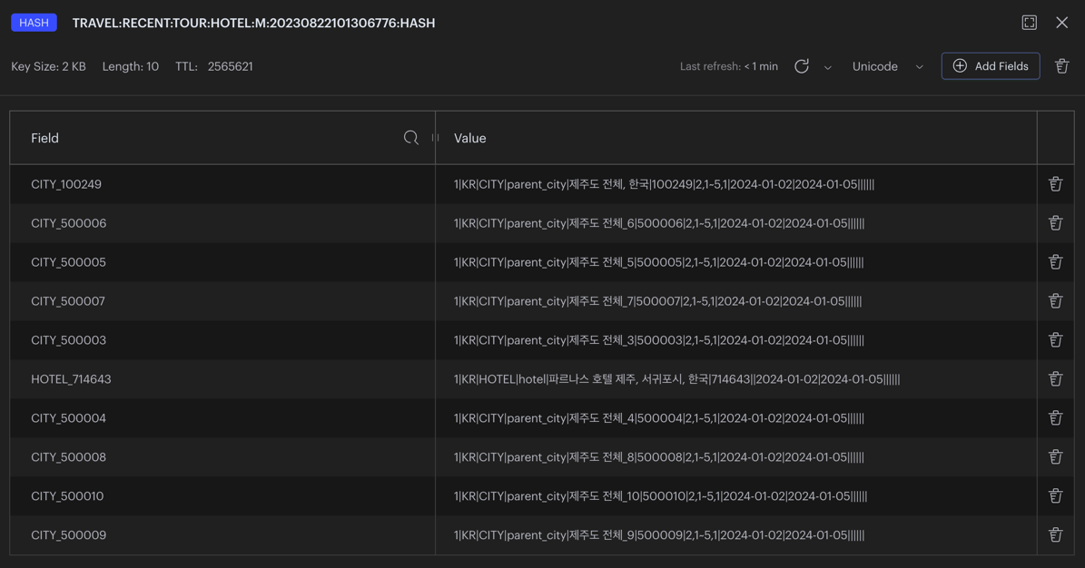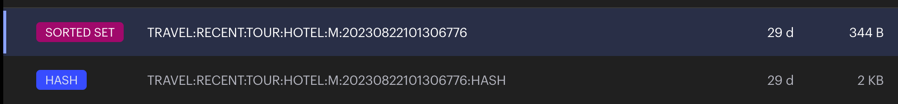 최근 검색 캐시 데이터는 정렬을 위한 Sorted Set 과 상세 데이터 저장을 위한 Hash 두가지 캐쉬데이터를 한셋트로 관리함