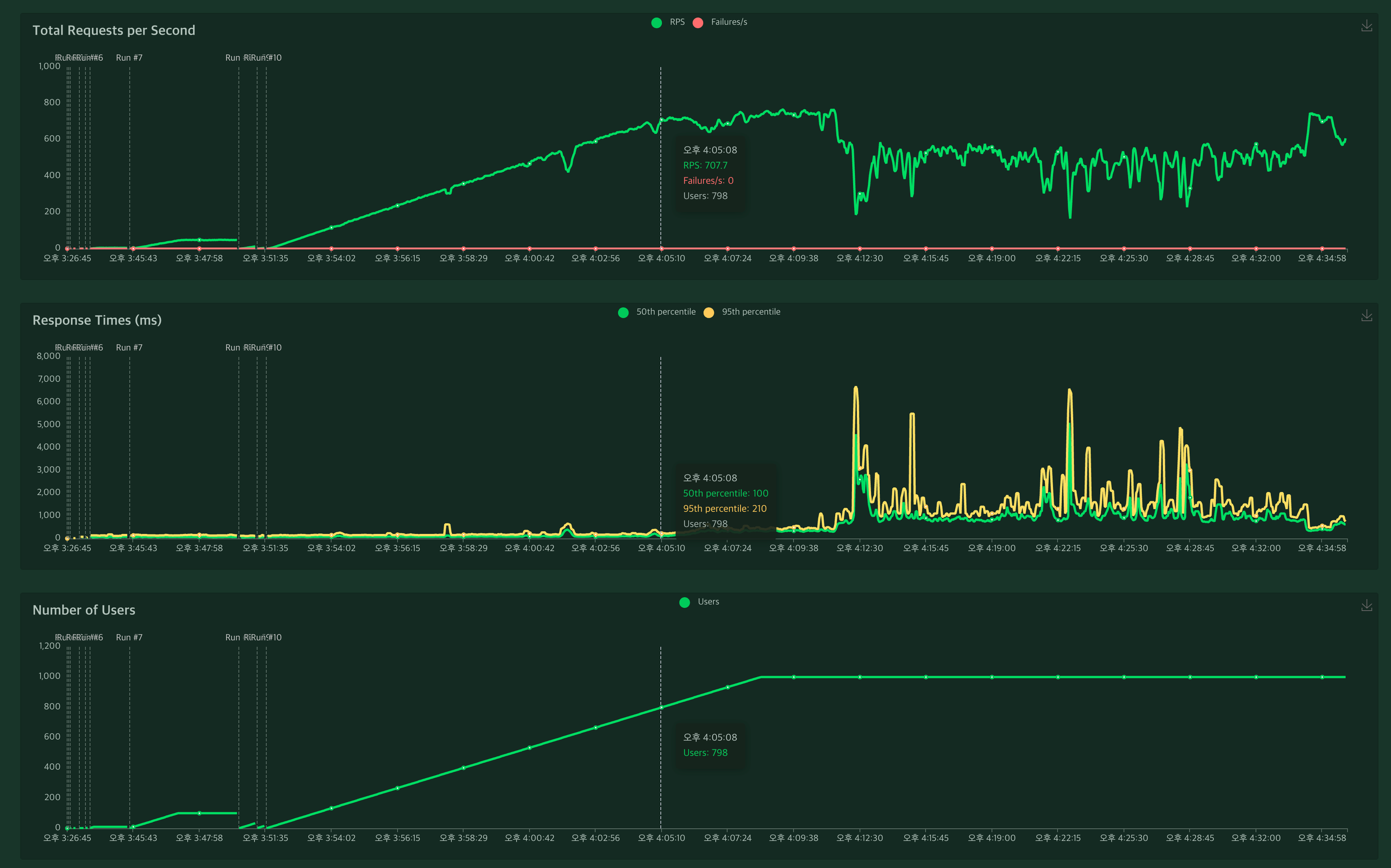 - RPS(초당 요청 개수) 700건 이상은 최소 100ms 최대 210ms 처리 속도가 유지됨 (실패는 0건)