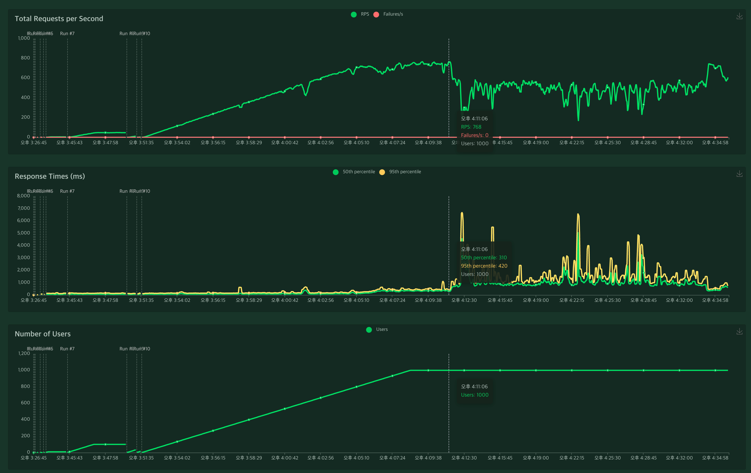- RPS(초당 요청 개수) 768건 기준으로 최소 310ms 최대 420ms 처리 속도가 유지됨 (실패는 0건)