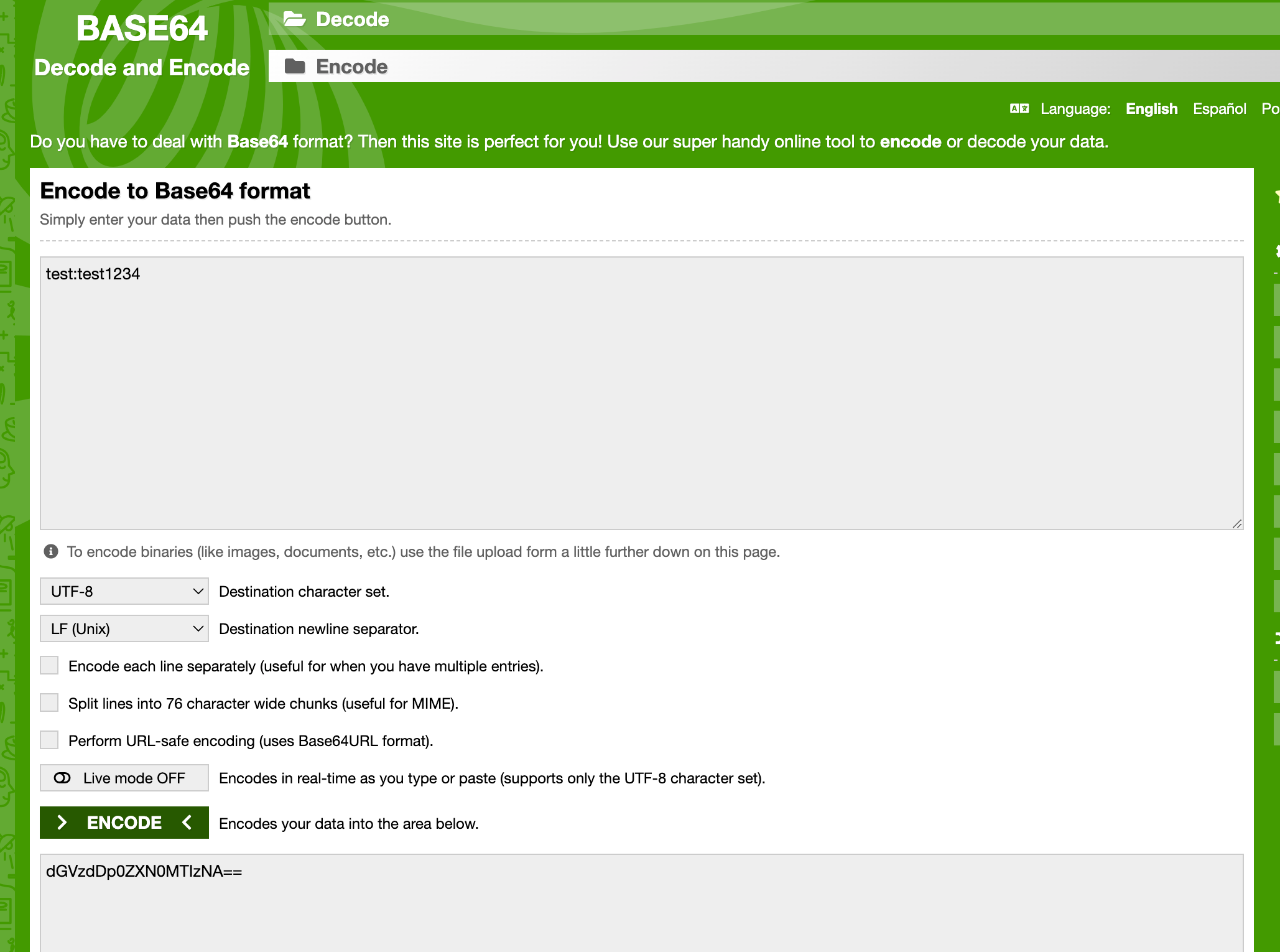 Authorization: Basic dGVzdDp0ZXN0MTIzNA==