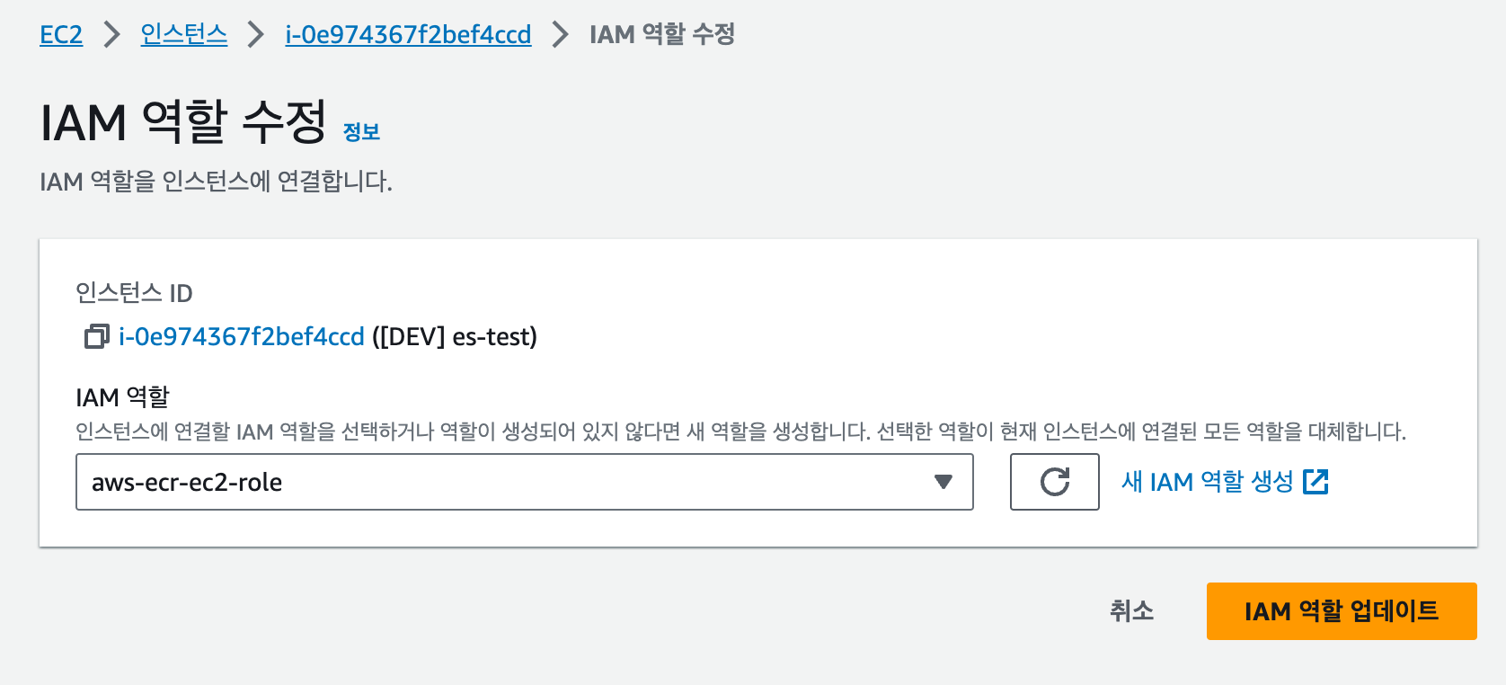 생성한 IAM Role(aws-ecr-ec2-role)을 EC2에 연결하면 EC2에서 ECR 접근이 허용된다