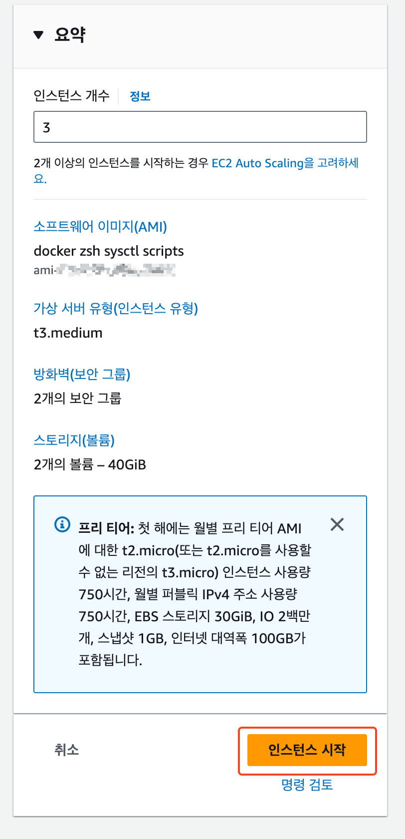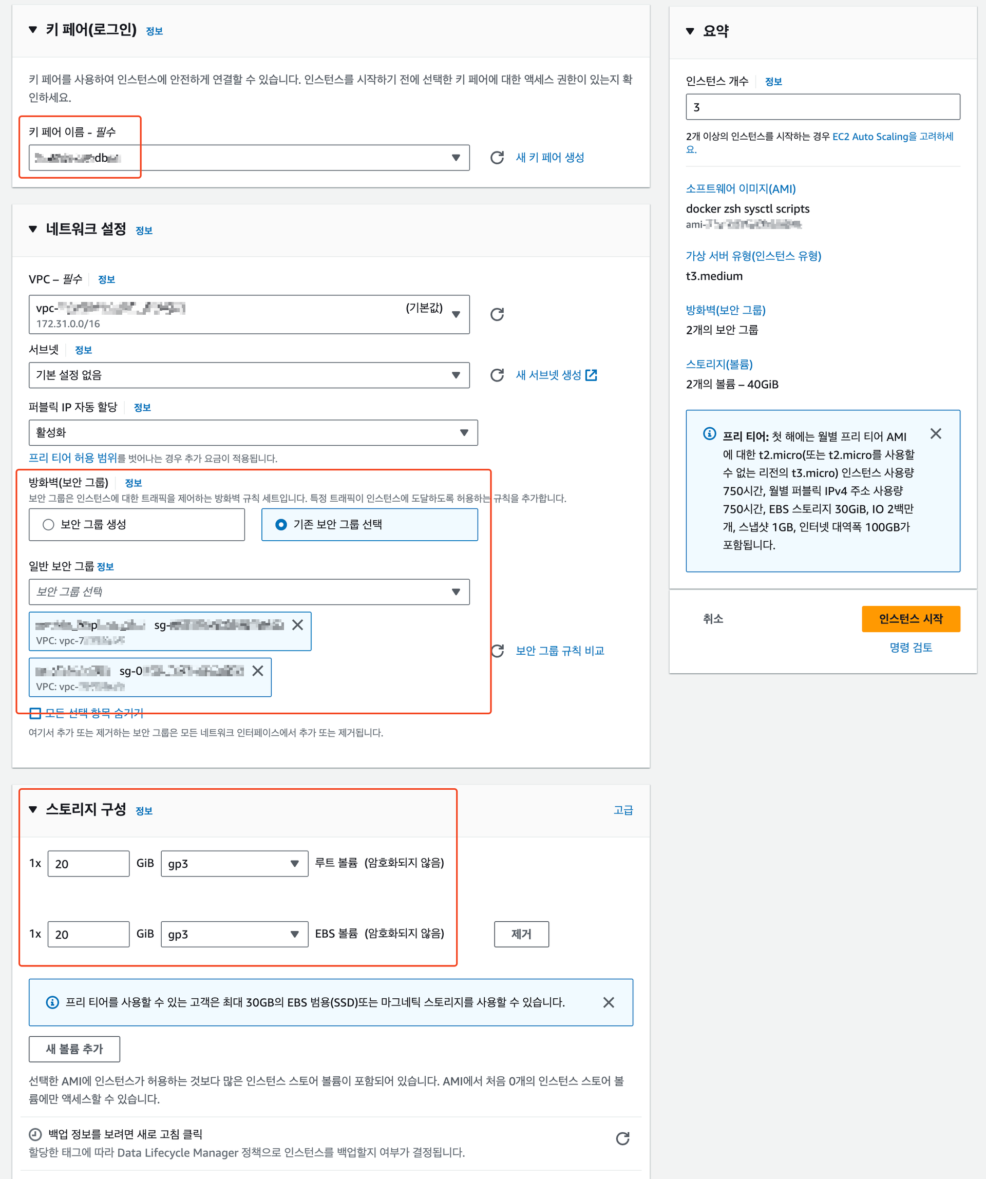 스토리지 20GiB 추가볼륨 20 GiB (기본 8GiB 는 용량이 부족함 도커 이미지 때문에 넉넉히)