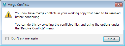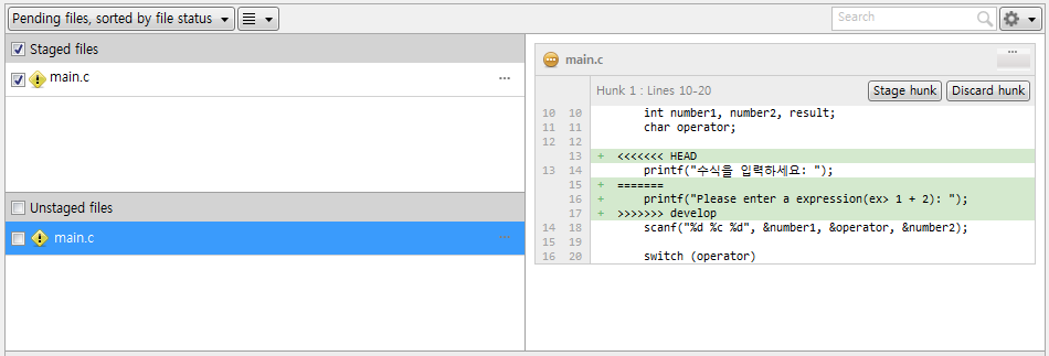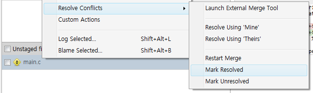 - 충돌을 해결한 파일은 충돌 해결로 표시합니다.