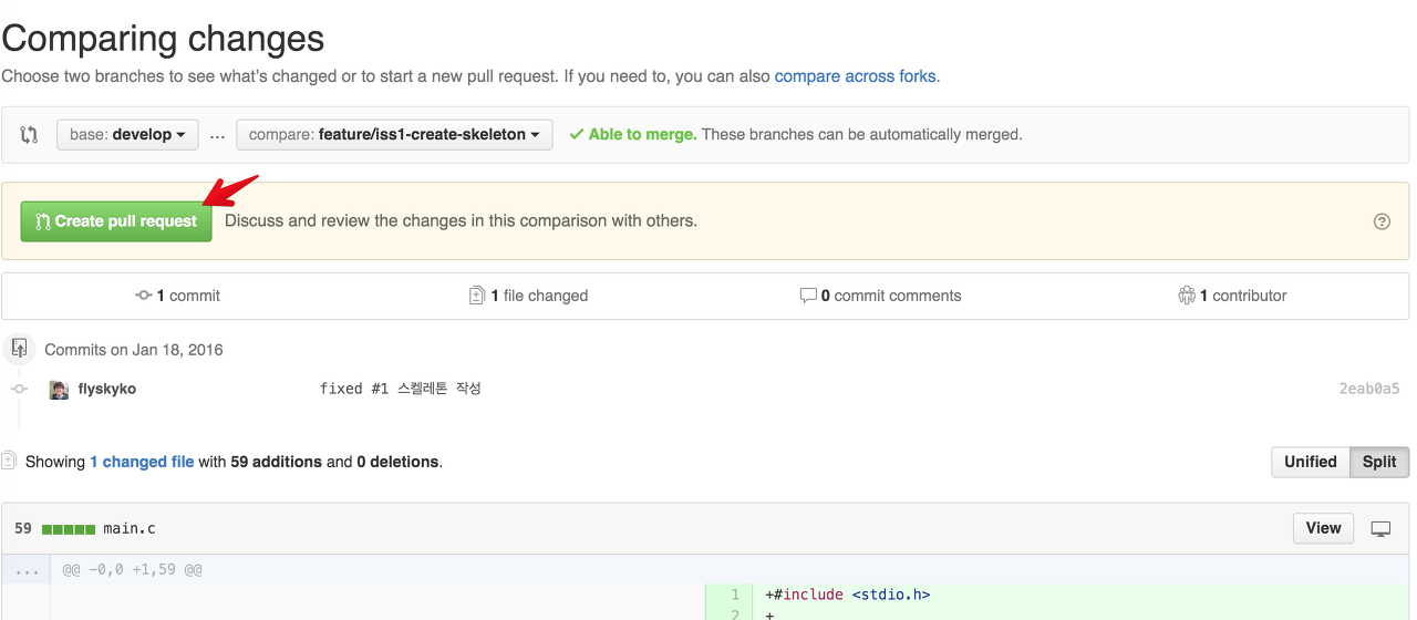 두 feature 브랜치의 풀리퀘스트를 생성할 때는 두 풀리퀘스트가 모두 머지 가능하게 표시될 것입니다.