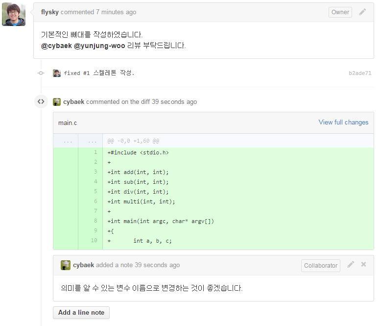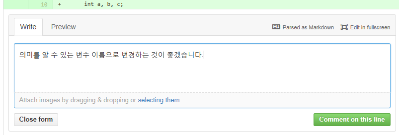 - 조원은 diff 화면에서 특정 라인에 대한 의견을 작성