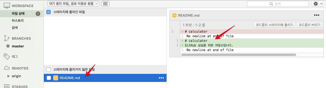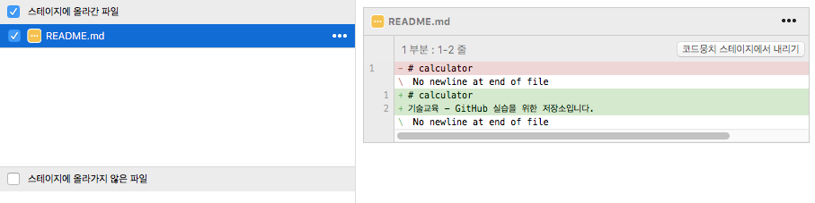 - 수정한 파일을 곧 커밋할 것이라고 표시