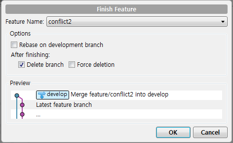 - 다시 feature/conflict2로 체크아웃한 후 develop을 머지합니다.