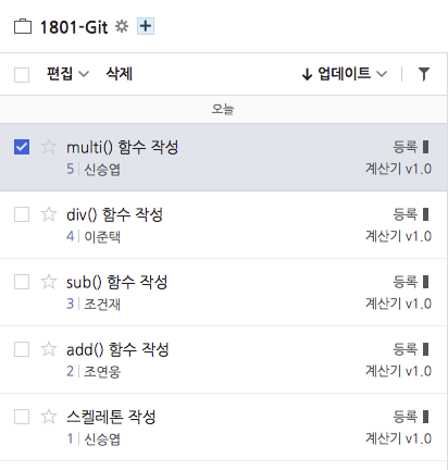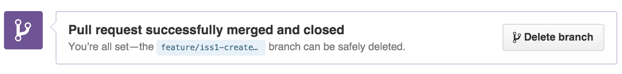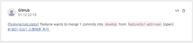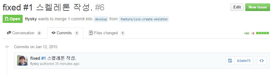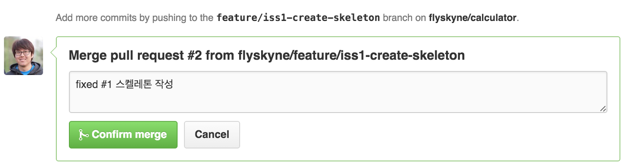 풀리퀘스트 페이지의 머지 버튼을 이용하여 feature 브랜치를 develop브랜치로 머지하고 로컬의 feature 브랜치 정보를 정리합니다.