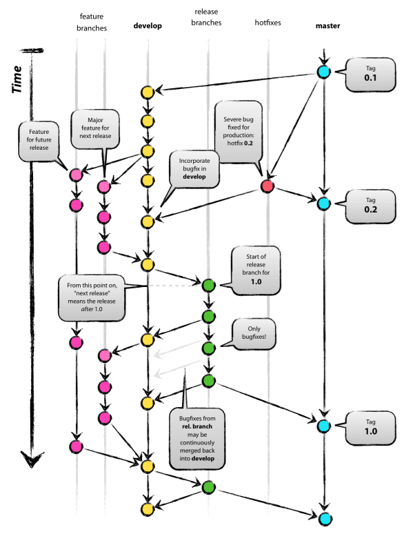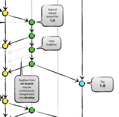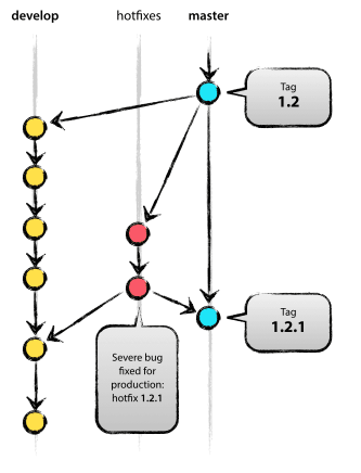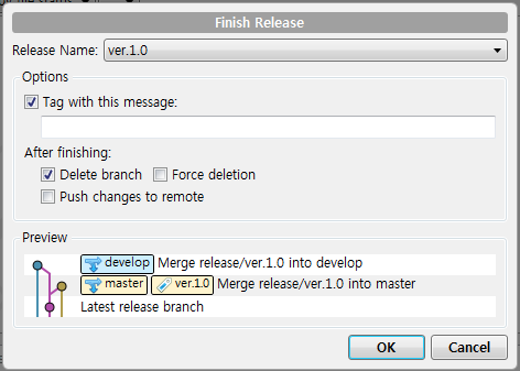 - 릴리즈를 완료하면 릴리즈 브랜치가 develop과 master에 머지되고 tag가 생성됩니다.