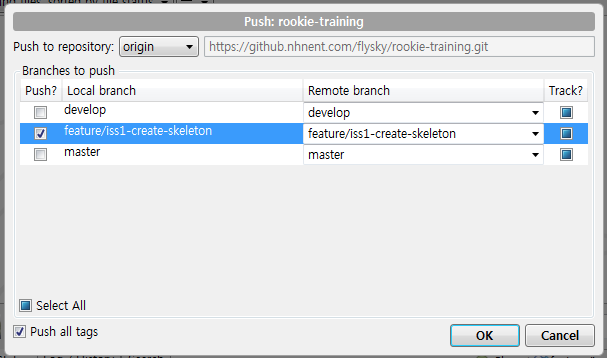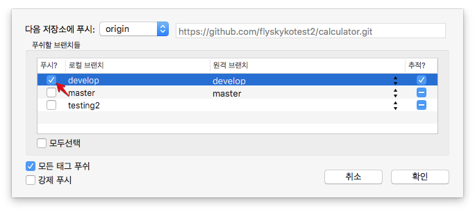 - 그 후 develop과 master, tag까지 푸시해 줍니다.