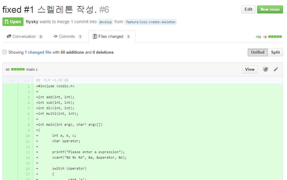 - main-2.c 파일을 복사해 main.c 내용을 변경한 후 커밋