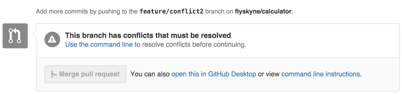 하지만, conflict1의 풀리퀘스트를 먼저 머지한 후에 conflict2의 PR 페이지를 보면 자동 머지가 안 되는 것을 확인할 수 있습니다.