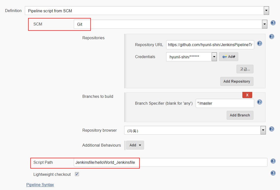 - Job 구성 > Pipeline script from SCM